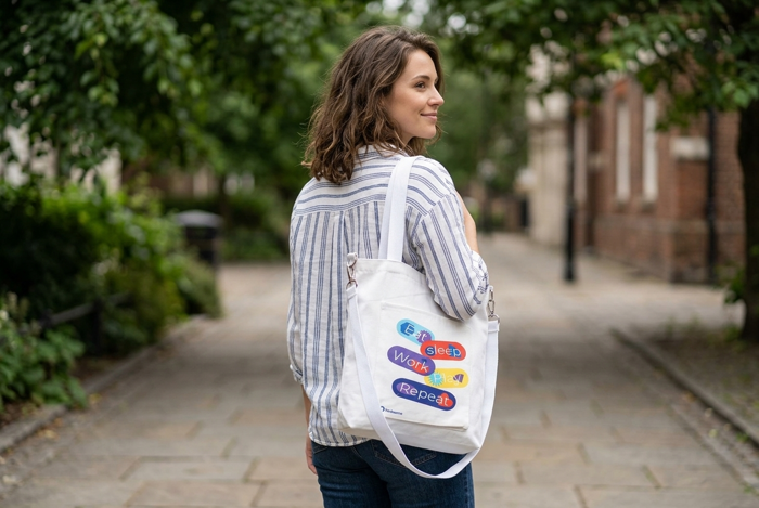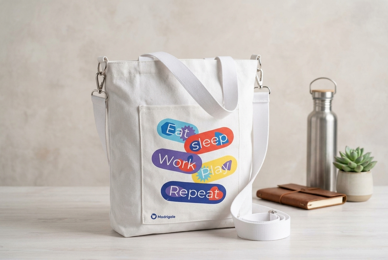 The front of the bag features a specialized pocket area that acts as a focal point for branding. As seen in our latest project (Eat, Sleep, Work, Play, Repeat), the flat surface allows for: